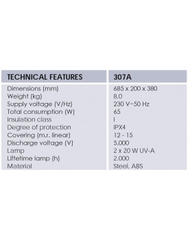 Se trata de un insecticida resistente construido en acero y plástico ABS de alta resistencia. El insecticida para uso profesional Mo-El Cri Cri 307A tiene un consumo máximo de 95W. Se recomienda usar en espacios cerrados o contenidos. De lo contratio el dispositivo atraparía no solo las plagas sino también los insectos beneficiosos.