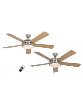 El ventilador de techo con luz CasaFan 9513260 Titanium incluye mando a distancia que permite controlar las 3 velocidades, el encendido, atenuación y apagado de la luz. También se puede controlar por medio de un panel a la pared que debe ser adquirido por separado. Tiene un diámetro de 132 cm y 5 aspas. Se pueden adquirir por separado aspas de otros colores (nuez, cereza). Este modelo es adecuado para habitaciones con un tamaño de más de 17 m2 y de una altura de 2,5 m - 2,9 m. Ofrece la posibilidad de instalar sin barra de extensión (sólo 19 cm entre las aspas y el techo). Las bombillas para el ventilador de techo son de hasta máx. 40 W con rosca E27 (no están incluidas) que permite el uso de lamparitas de bajo consumo (E - A++). La luz sale de manera uniforme gracias a la tecnología de escarchado en el difusor. Este ventilador doméstico tiene 3 velocidades: max. 195 r.p.m. a una potencia que va de 9 W a 66 W. La tecnología inversa permite la refrigeración en verano y el calentamiento de la habitación en invierno (empuja el aire caliente hacia abajo desde el techo). El ventilador para techo 9513260 Titanium de CasaFan puede ser montado en un techo inclinado con ángulo de hasta 22°.