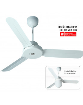 otor blanco está reforzado con resina termoplástica (ABS) resistente al calor y a los rayos UV. Las aspas, también blancas, disponen de recubrimiento en polvo de poliéster resistente a los arañazos. El cableado se mantiene oculto en cúpulas moldeadas de resina termoplástica (PP) resistente a los impactos y a los rayos UV. El ventilador se puede instalar en techos incliandos, con una inclinación máxima de 22º.