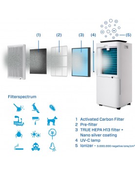 49,01 €Filtro de repuesto para el Comedes Lavaero 1000. Prefiltro antibacteriano. Filtro HEPA elements. Filtro carbón activo. Filtro catalítico. Vida útil de 6-12 meses. .Deshumidificador y purificador de aire CLEAN AIR OPTIMA CA-705 Smart