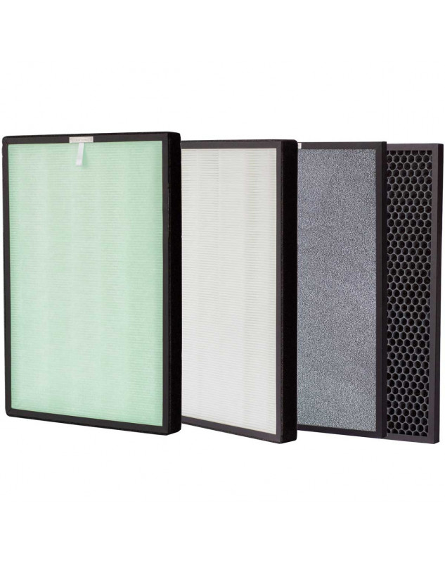 Conjunto completo de filtros compuesto por 2 elementos filtrantes combinados (prefiltro antibacteriano + elemento HEPA y carbón activado + filtro catalítico).