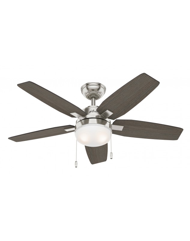 El ventilador para techos Hunter tiene 3 aspas de color marrón (tono claro) o blancas, siendo estas reversibles. Dispone de 3 velocidades, que llegan a un máx. de 189 r.p.m., y con una potencia entre los 18 W y 62 W.